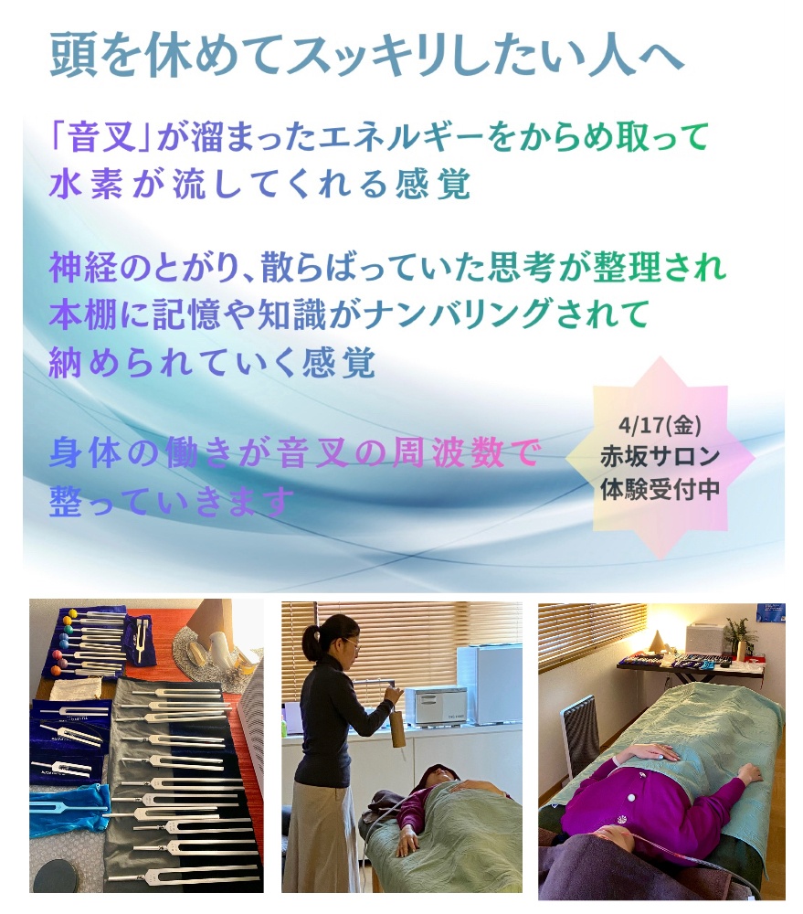 金属の音叉が出す一定の周波数の澄んだ音、微細な振動刺激により呼吸を深く、思考のノイズを落ち着かせていきます。